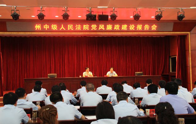 恩施法院网讯 5月23日上午,州中院在机关11楼召开党风廉政建设专题报告会,邀请州纪委副书记周辉军为干警作报告。州中院全体干警职工及恩施市法院党组成员、专委聆听了报告。受武星院长委托,报告会由党组副书记、副院长许勤举主持。
