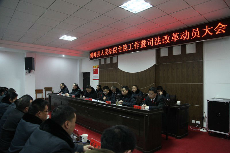 恩施法院网讯(通讯员 罗华忠 许茂林 钟俊)2014年12月31日,鹤峰法院全院工作会议暨司法改革动员大会在机关三楼会议室召开,全院干警职工参加会议。党组书记、代理院长舒业树作会议主题讲话并传达了全省、全州司法改革会议精神。党组副书记、副院长赵拥军主持会议并传达了县委十四届六次全体(扩大)会议精神,对审判管理有关工作进行了安排。