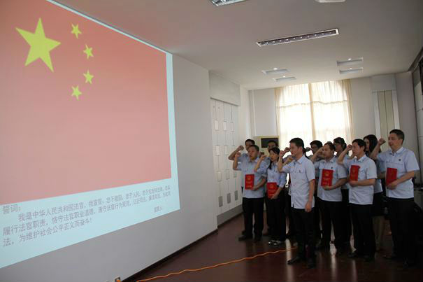 新任的审判员身着法官服,手持红色的任命书,面对国旗庄严宣誓:“我是中华人民共和国法官,我宣誓,忠于祖国,忠于人民,忠于宪法和法律,忠实履行法官职责,恪守法官职业道德,遵守法官行为规范,公正司法,廉洁司法,为民司法,为维护社会公平正义而奋斗!”声声誓言回荡在会场上空,让每一名干警都更加深刻的感受“法官”职业的神圣,更加清楚的认识到肩负的责任和奋斗的方向。